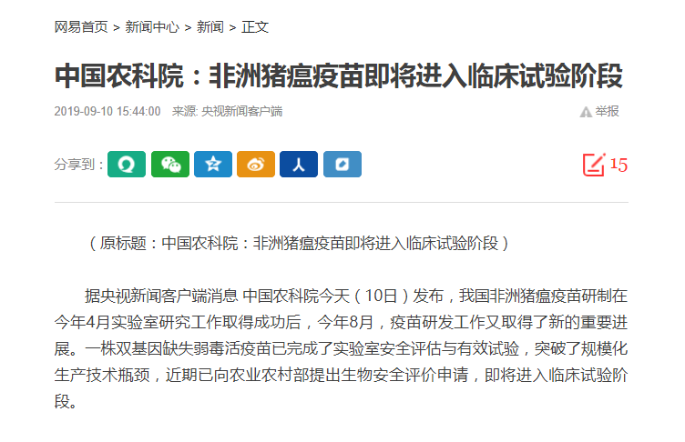 與此同時(shí),中國(guó)農(nóng)科院今日發(fā)布,非洲豬瘟疫苗即將進(jìn)入臨床試驗(yàn)階段,對(duì)養(yǎng)豬人來說,這無疑是最大的利好消息。