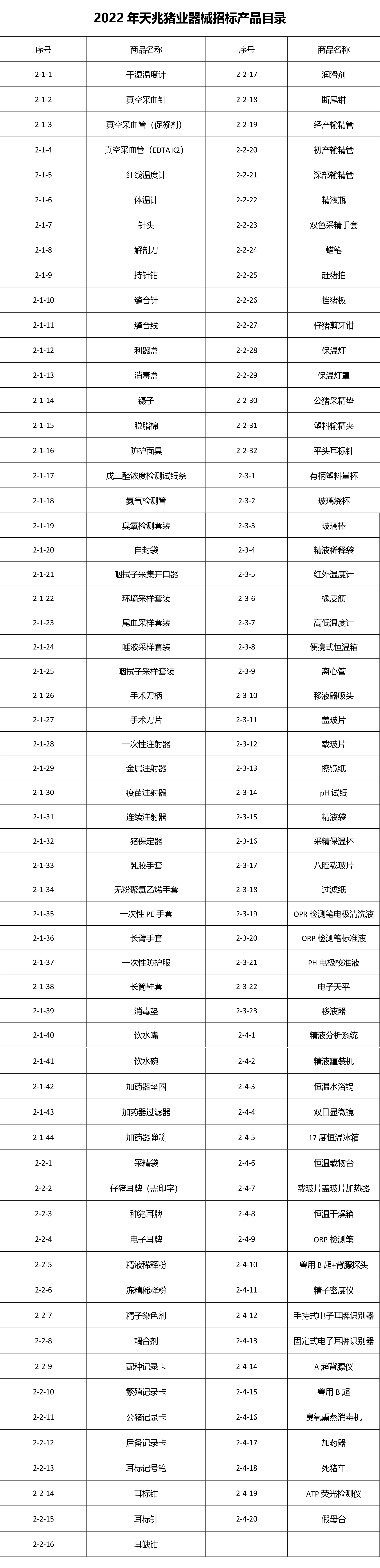 豬場(chǎng)內(nèi)獸醫(yī)、生物安全、生產(chǎn)及育種相關(guān),精液檢測(cè)實(shí)驗(yàn)室用器械、耗材、試劑和儀器設(shè)備等。招標(biāo)產(chǎn)品參見(jiàn)附件《2022年天兆豬業(yè)實(shí)器械招標(biāo)產(chǎn)品目錄》,但不僅限于附表。